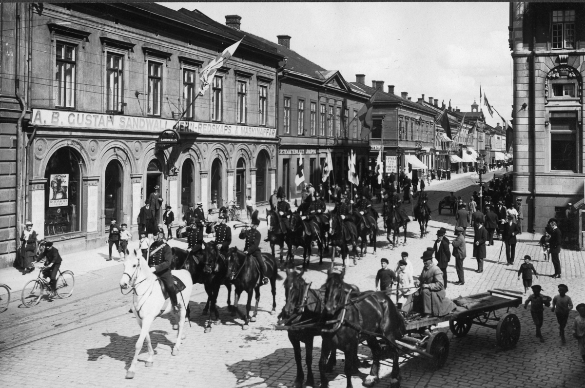 Röda Kors-parad. Ryttare på Ö. Storgatan, Jönköping.