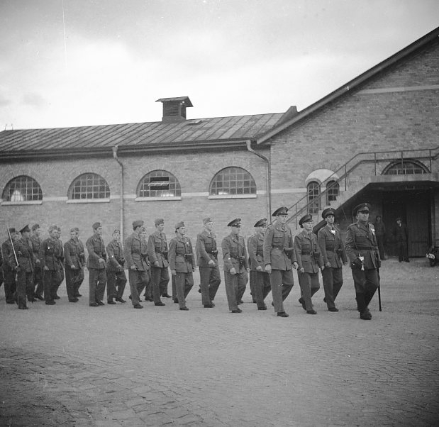 Marscherande trupp vid södra gaveln på klockgaraget.