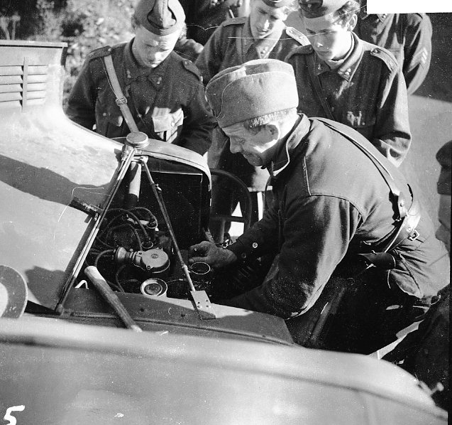 Fordonet på bilden är en Volvo TPV (TerrängPersonVagn). Konstruktör var Måns Hartelius och 210 stycken togs fram till krigsmakten. Nr 3 gick till Argentina för försäljning och nr 209 till Jönköpings brandkår. TPV visades första gången på Stockholmsmässan 1 september 1944. De flesta tillverkades mellan september 1945 till februari 1946. Armén kallade den för Terrängpersonbil m/43, tgpbil m/43. Med radio radioterrängpersonbil 25W m/39. Radion heter 25W Bl m/39. Från 50-talet fick bilen sitt namn ratgpbil 911 25W. Tjänstgjorde fram till 1965 då de flesta såldes på överskott för 600 kr. Mannen på bilden har tagit bort luftrenaren för att komma åt Carterförgasaren som troligtvis flödar för att nålventilen har hängt sig. Därav hammaren som behövs för att knacka på förgasaren. Vidare ser man att det är ett radioavstört system, fördelaren är inkapslad. Detta exemplar är då utrustad med en 25W radio, en av 82 stycken som fick det. Fotografiet är taget från 1946 fram till 1960 med tanke på uniformerna då m/59 kom.