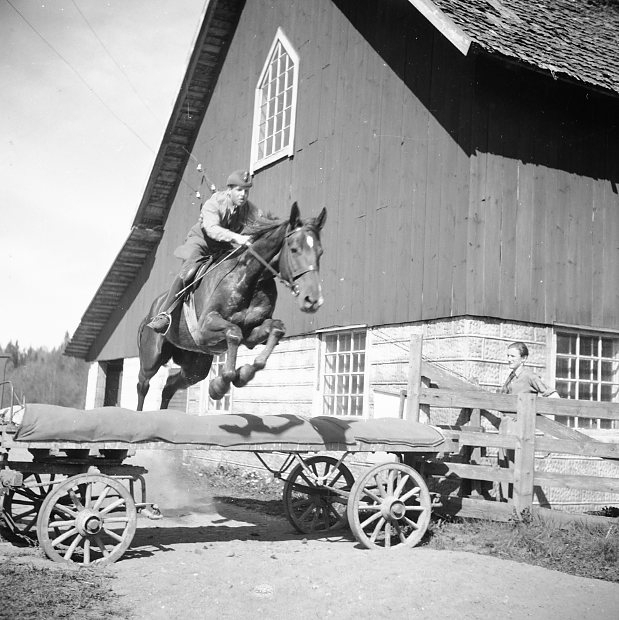 Hästhoppning. Fältritt. Ekipage som hoppar över en vagn.
