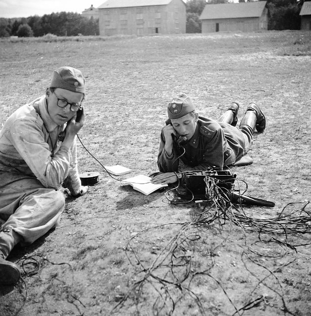 Signalister varav ett befäl. Förråd på sjukhusvägen i bakgrunden.