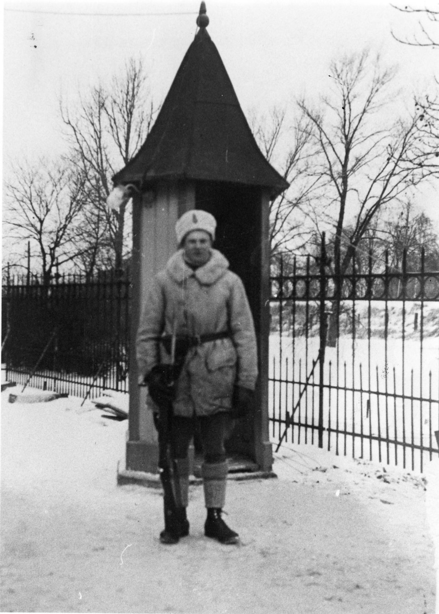 Pettersson, vpl. På vakt vid postkuren, kasernvakten, A 6. Vinter.