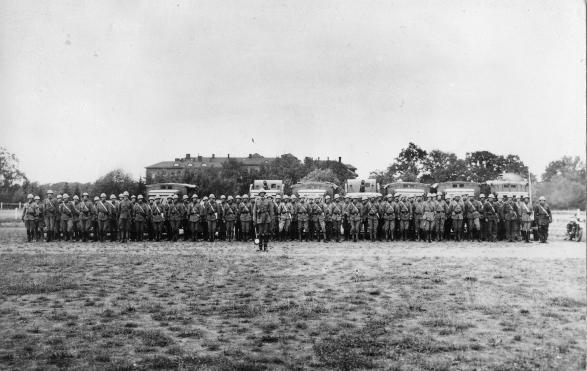 Personal, 2.Batt. 7,5 cm, upplastat. Uppställda framför fordonen. A 6. Batterichef kapten Ohlsson-Tillmark.