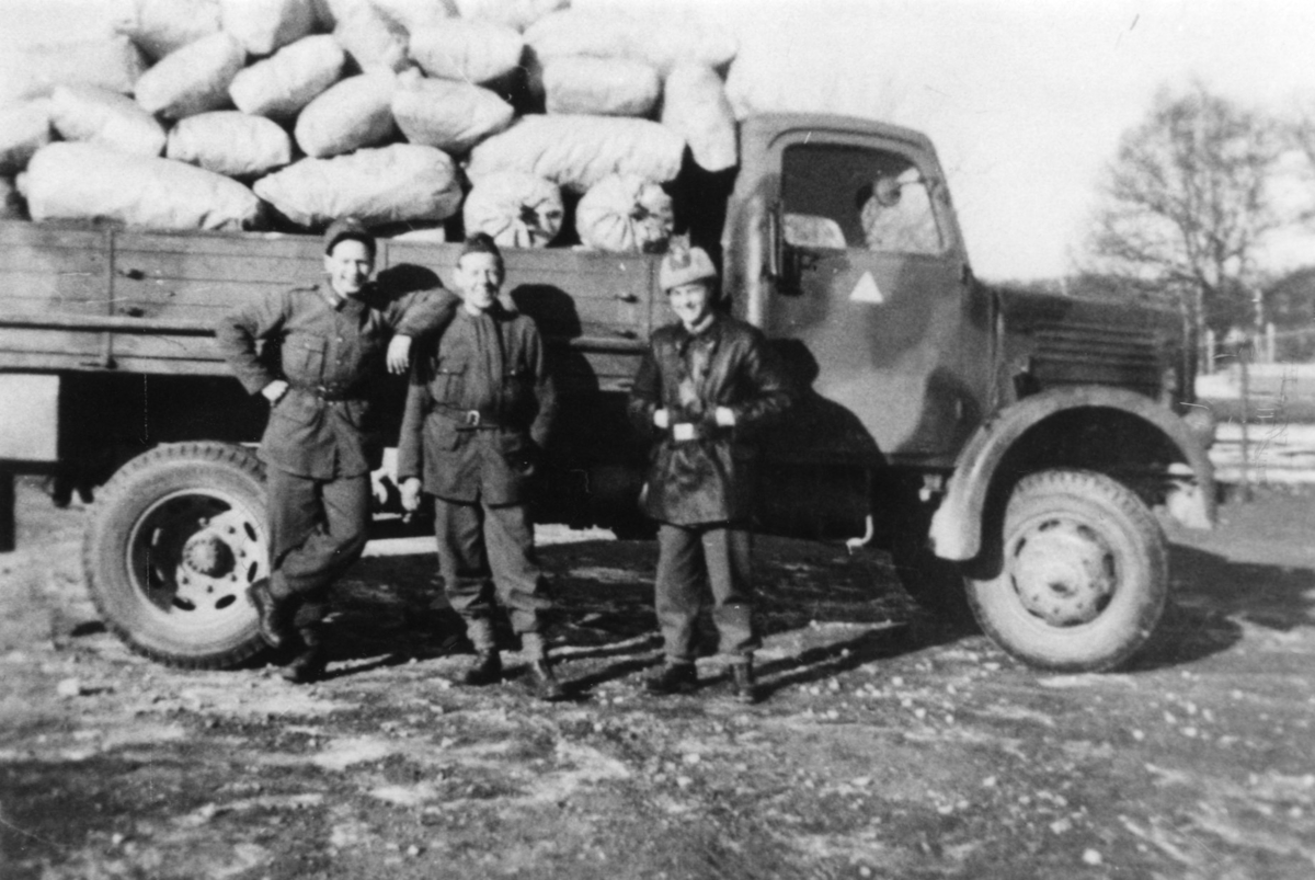 Terrängbil m/1942 M, Klöckner. Till höger Nils Gustavsson. Skåne.