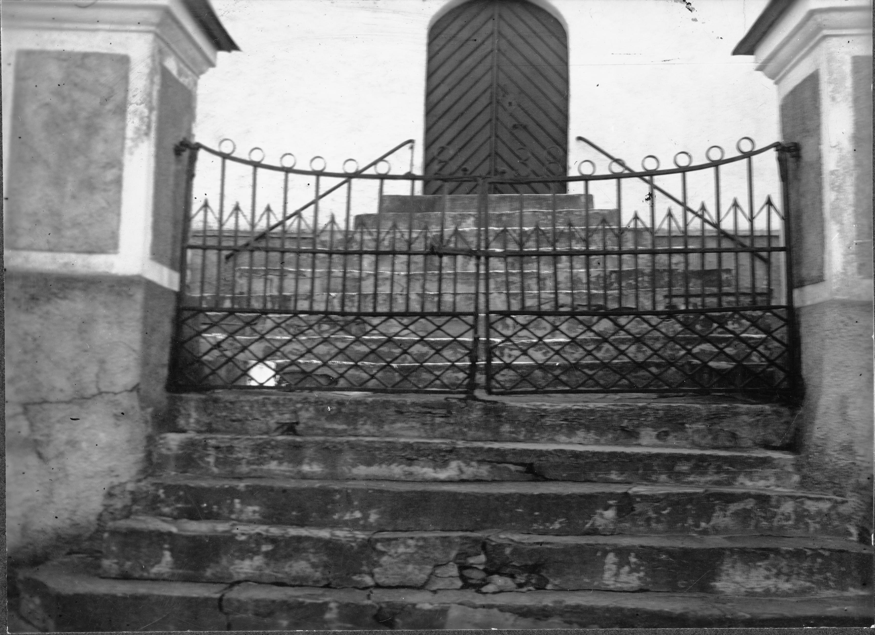 Kyrkogårdsgrinden och trappan på kyrkans västra sida.