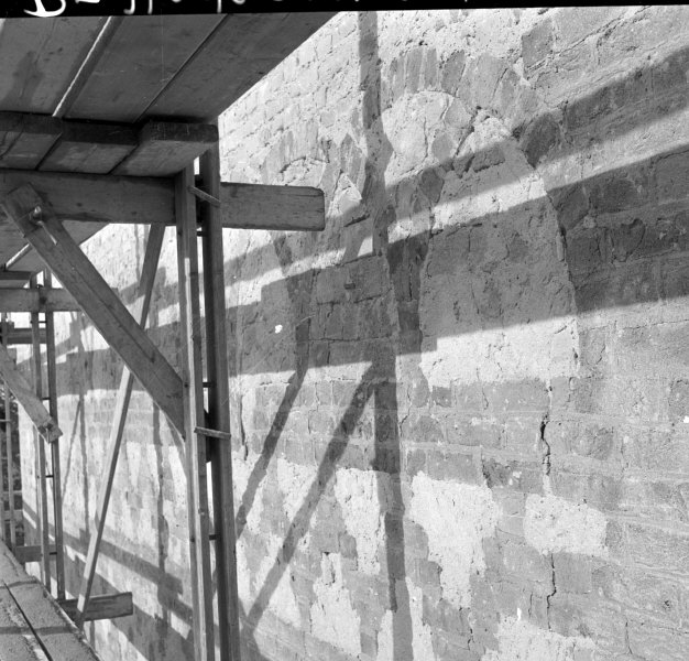 Blinderingsbanden på tornets västra sida fotograferade i ordning uppifrån och nedåt. Byggnadshistorisk undersökning i samband med omputsning 1963. Foto nr. 16.