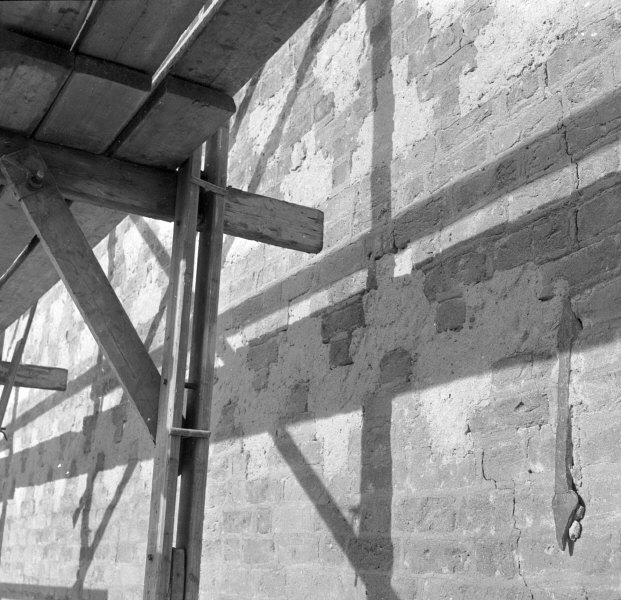 Blinderingsbanden på tornets västra sida fotograferade i ordning uppifrån och nedåt. Byggnadshistorisk undersökning i samband med omputsning 1963. Foto nr. 17.