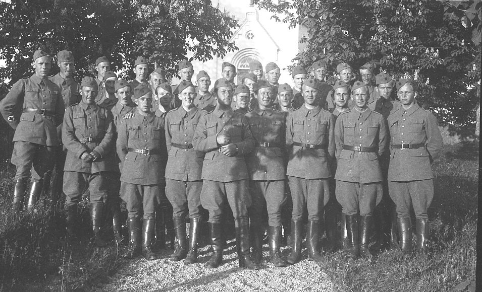 Värnpliktiga framför kyrka.
