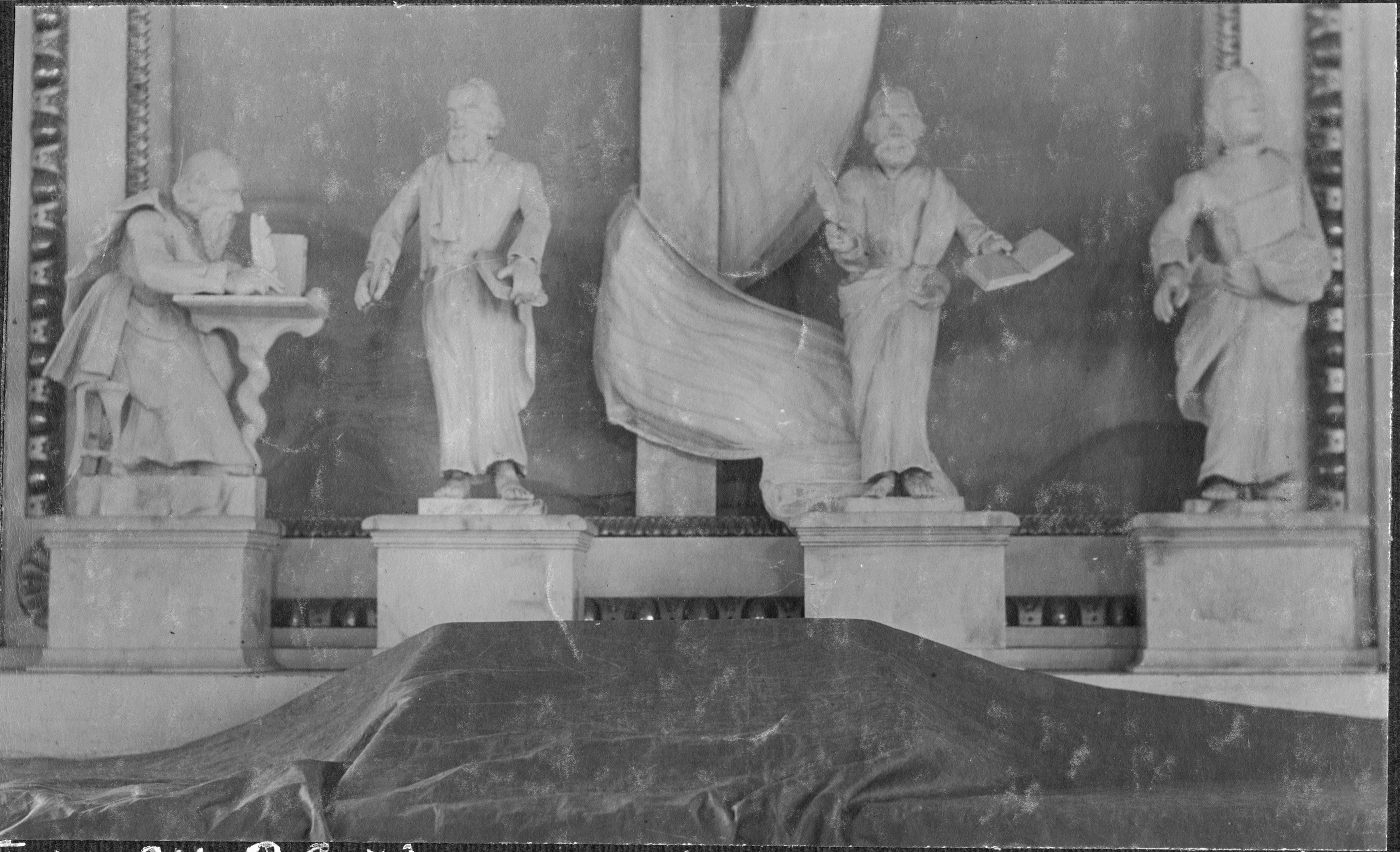 Evangelistfigurer snidade i trä, Mattehus, Markus, Lukas och Johannes.
