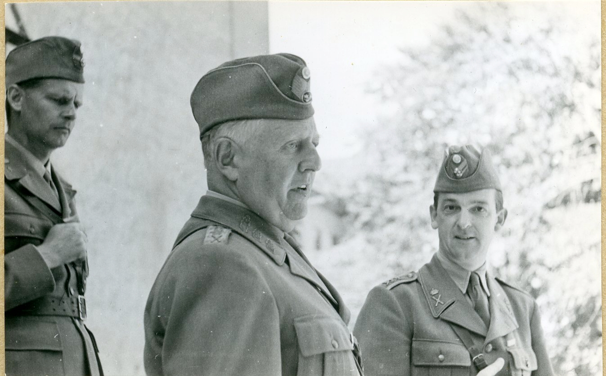 General Ehrensvärd inspekterar på Frösunda i sällskap med sin adjutant överstelöjtnant Colliander och kårens representant major Montgomery.