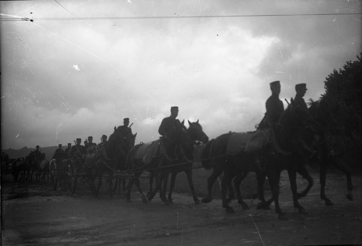 Titel: Hästanspännd pjäsavdelning ur A 2 på väg till Tånga Hed.