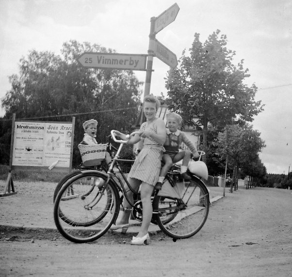 Kvinna med cykel och barn i barnsadlar.