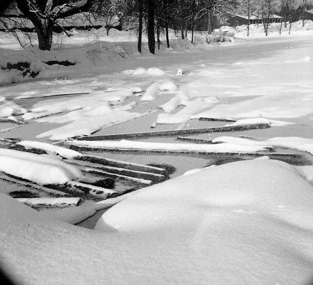 Virkesupplag vid en såg. Vinterbild. Villingsberg ?.