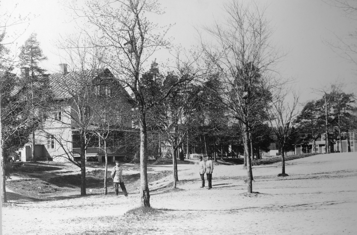 Från vänster Södra Marketenteriet, Lägerhydda nr.48, Lägerhydda nr.44. Samtliga byggnader är rivna.