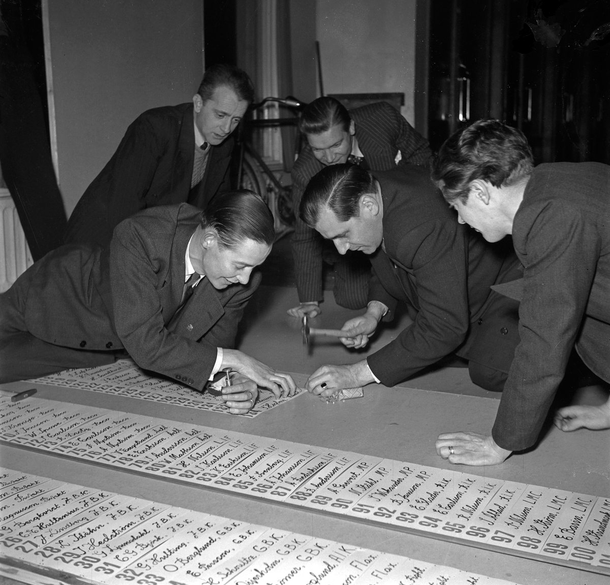 Fem män är sysselsatta med att sätta upp resultatlistor i samband med tävling anordnad av Jönköpings cykelklubb.. Övre raden: Thorvald Jaensson (1). Undre raden: Nils Sjögren (1), Gustaf Adolf Collin (2), Lennart Hagelin (3).