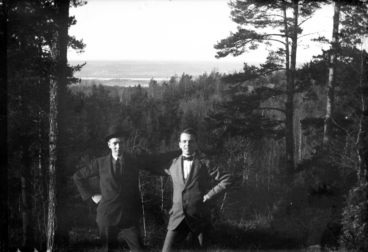 Två män står med armarna på varandras axlar på en höjd i skogen. I bakgrunden syns bebyggelse och vatten.