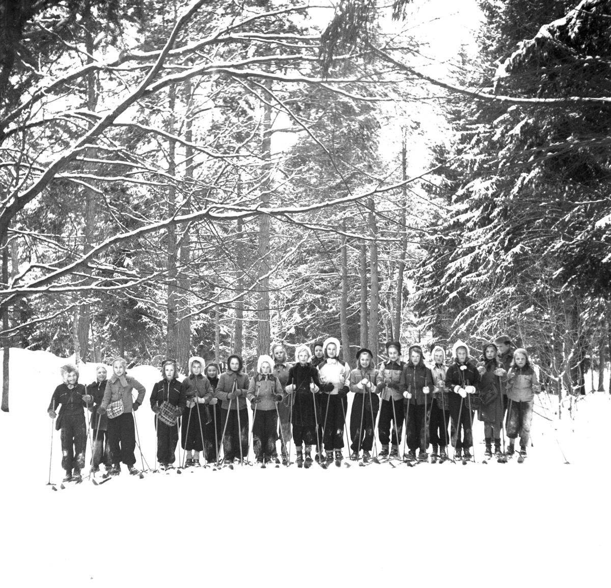 Skolungdomar uppställda med skidor i Jönköpings Stadspark.
