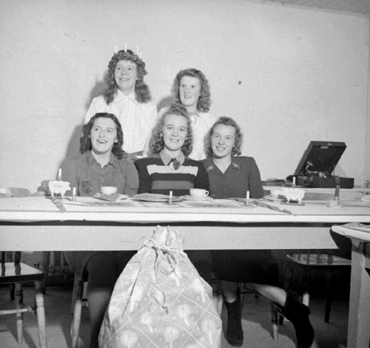 Fem flickor vid ett bord med en vevgrammofon i bakgrunden. Den ena flickan är klädd i vitt Lucialinne och har ljuskrona på huvudet. På bordet står kaffekoppar och små ljus och framför bordet en julklappssäck.