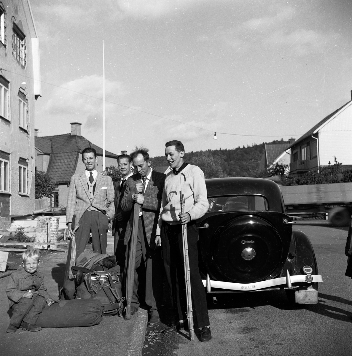 Vid Vättergatan i Huskvarna står fyra män, Arvid Bengtsson (3). De ska ut på en fisketur och i händerna håller de sina fiskespön. En pojke sitter på packningen, tält och ryggsäckar, som ligger på trottoaren.