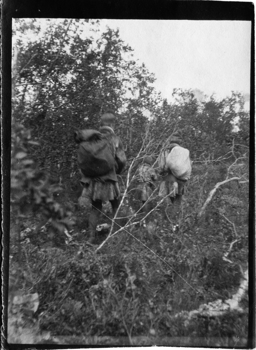 John Bauers Lapplandsresa sommaren 1904. Tre samer på vandring uppför sluttningen vid Ripainen, två med packning på ryggen.