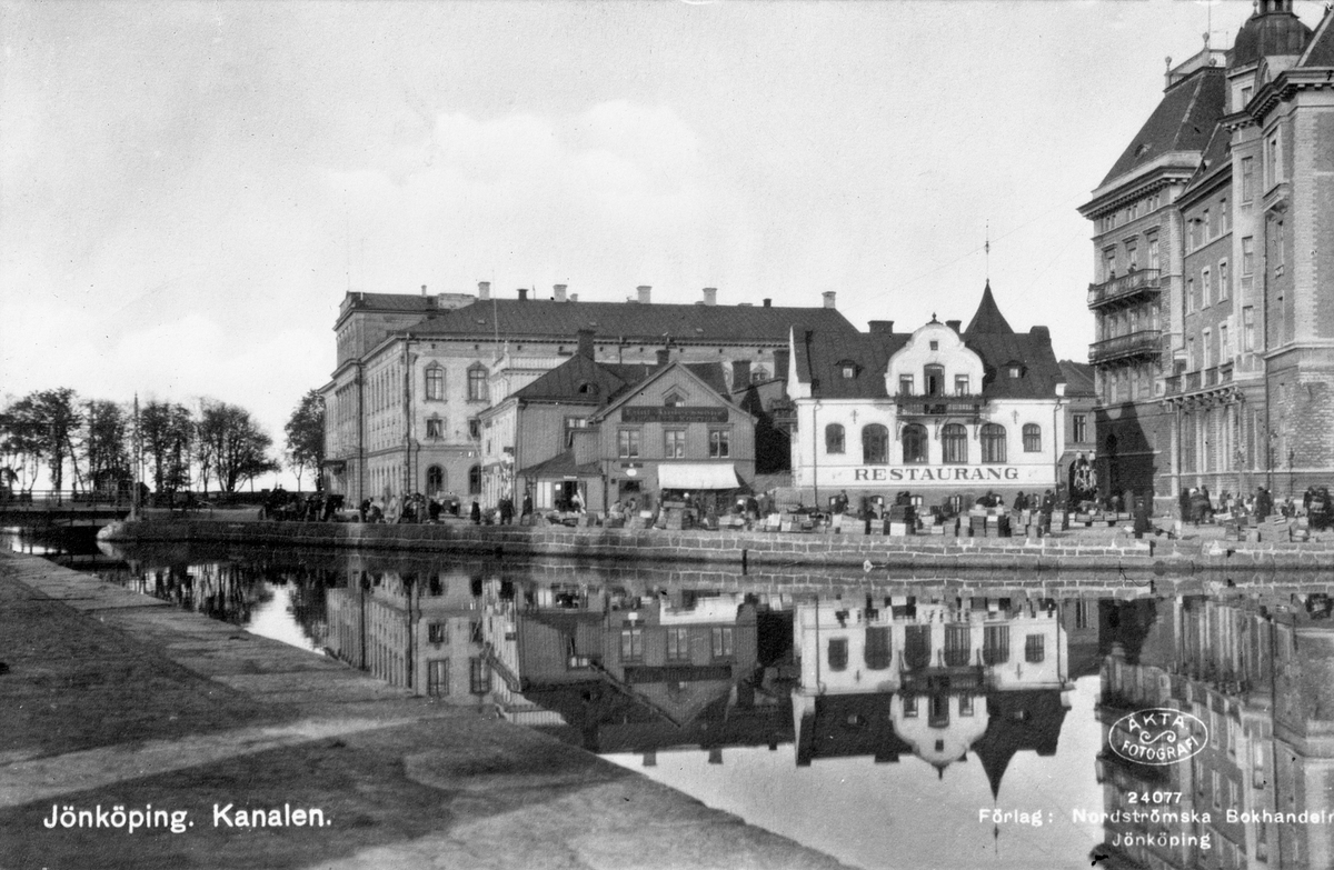 Kanalen i centrala Jönköping och hus vid Östra Storgatan. Det stora huset till vänster är Stora hotellet. En restaurang finns i det vita huset och platsen framför kallades Grönsakstorget eller Grännatorget. Här bedrevs handel med frukt och grönsaker.