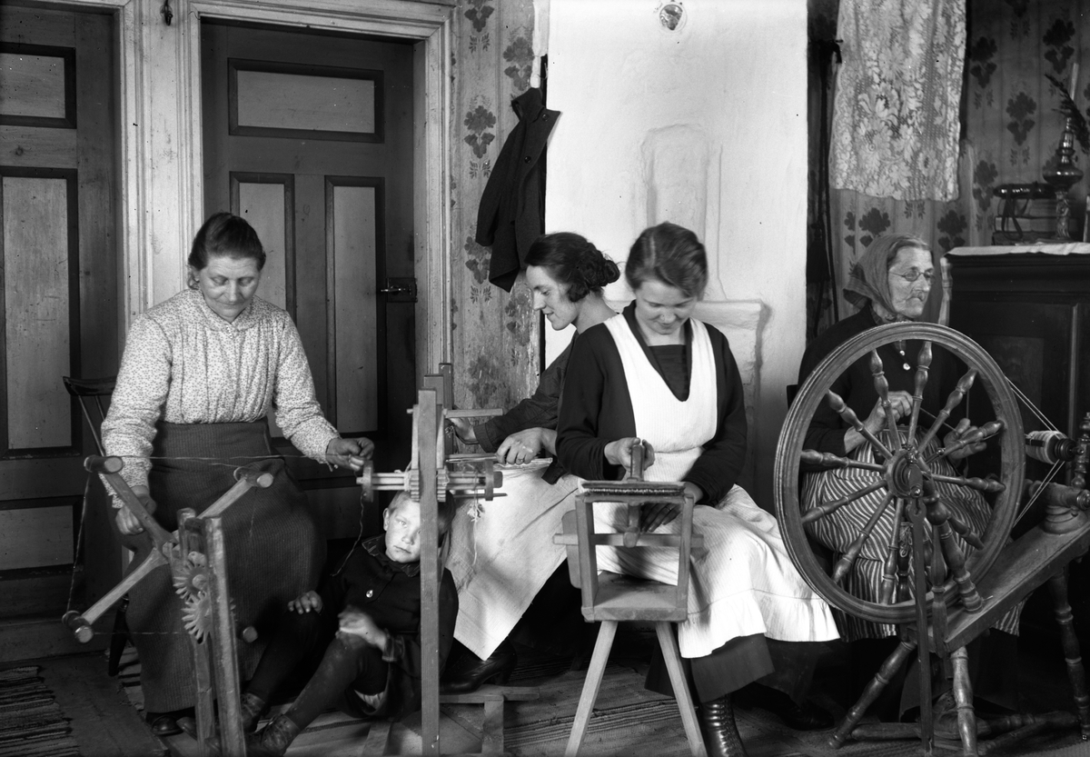 Fyra kvinnor i ett rum kardar, spinner och väver. En pojke sitter på golvet hos dem.