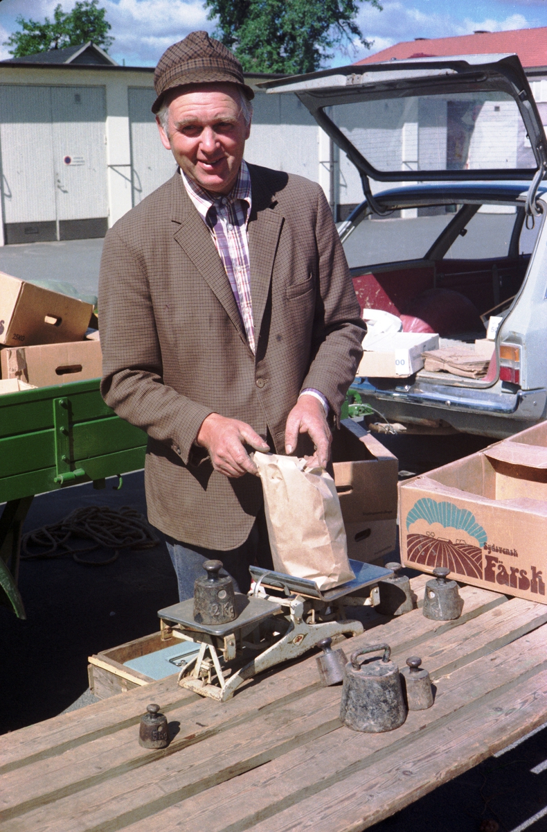 Bonden Carl-Ingvar Magnusson i Botarp säljer grönsaker vid ett stånd på Drottninggatan i Huskvarna, där numera Servicehuset Union ligger.