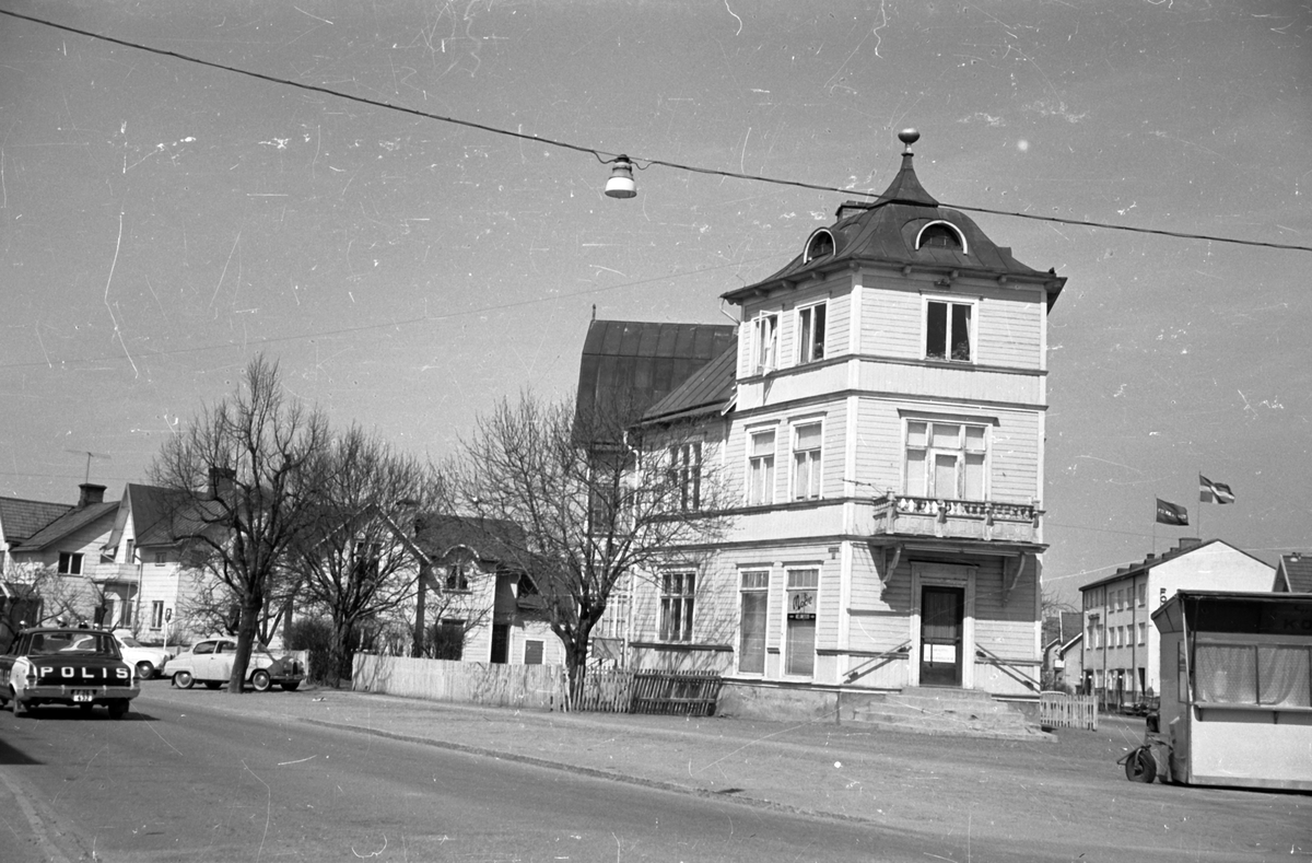 Rakt fram ligger huset "Cittran" vid korsningen Jönköpingsvägen - Vättergatan i Huskvana. På Jönköpingsvägen kör en polisbil.