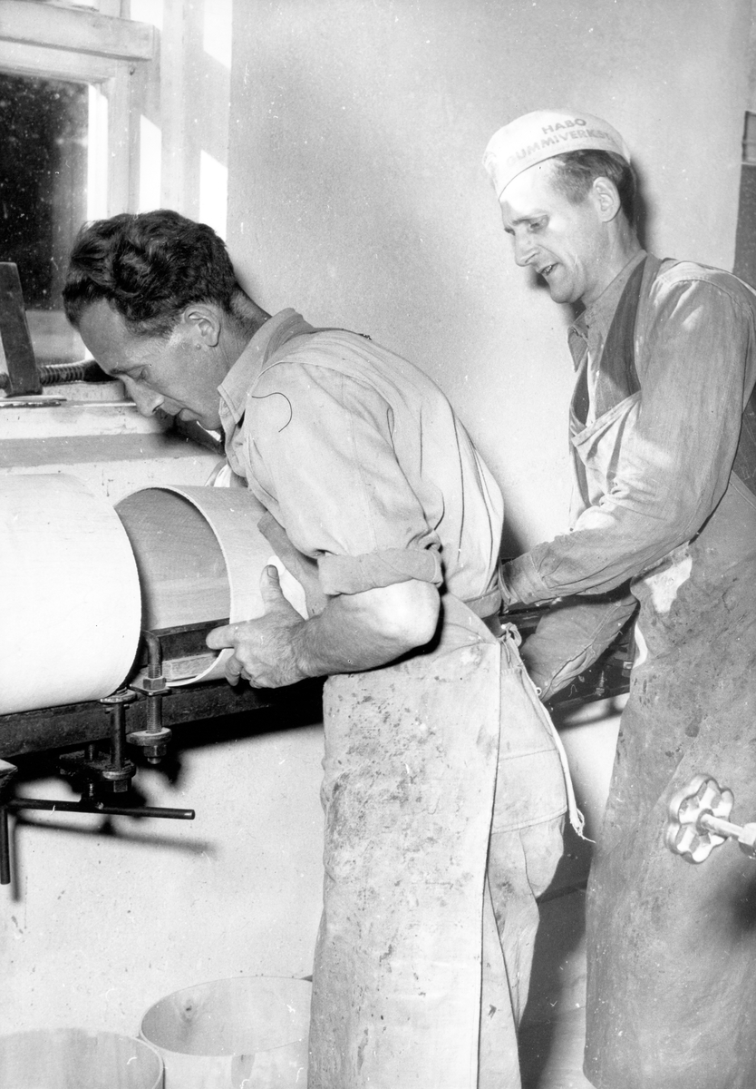 Vid Habo Laggkärlsfabrik på Munkvägen 8, arbetar Nils Karlsson och Sigurd Larsson med limning.