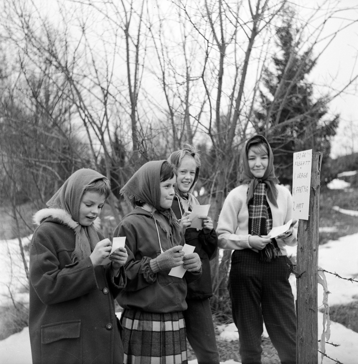 Fyra flickor på tipspromenad, från vänster: Christina Nilsson (3) och Berit Svensson (4). De försöker svara på frågan "Vad är en fregatt".