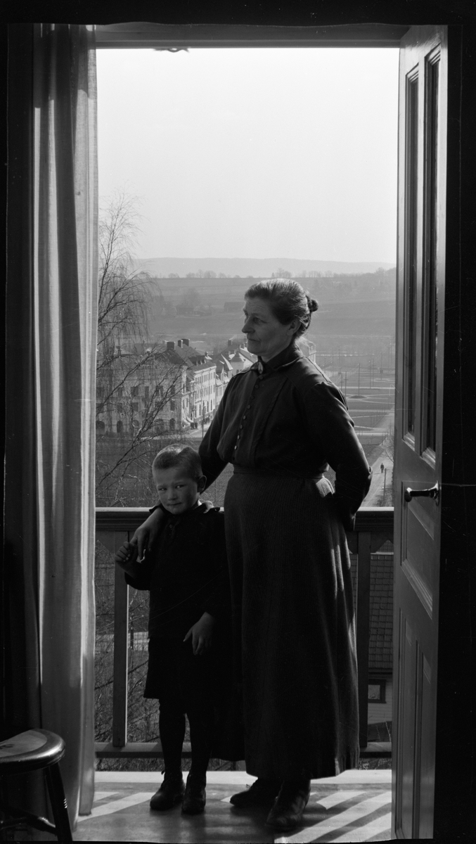 En kvinna och en pojke står på en balkong, bebyggelse syns i bakgrunden.