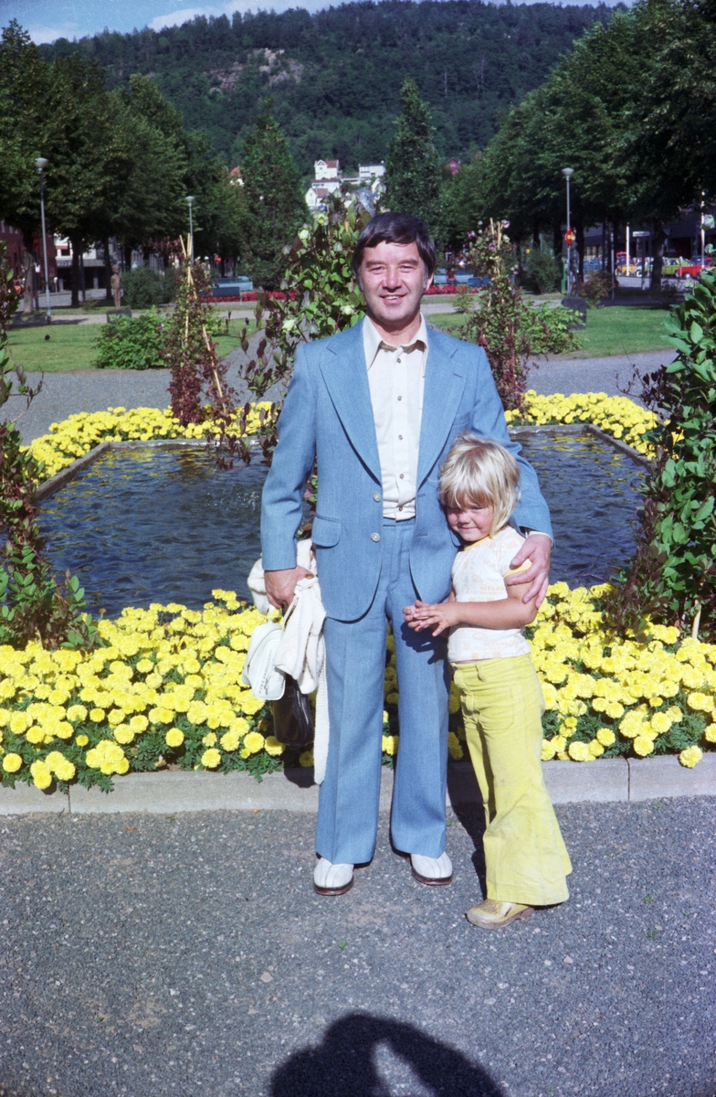 Brottaren Tore Damberg med dotter på Esplanaden i Huskvarna. Runt dammen bakom dem är gula tagetes planterade.