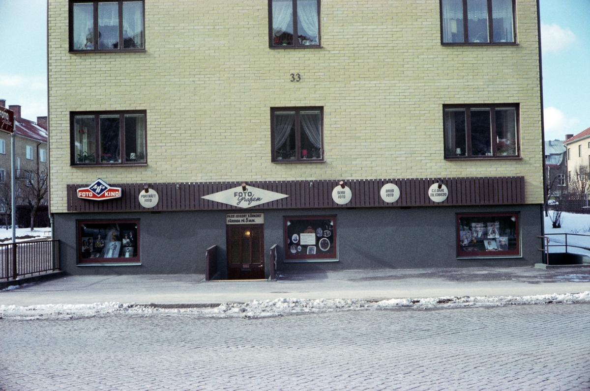 På Drottninggatan 33 i Huskvarna har C. E. Dahl fotoaffären FOTO-Grafen i källarplan. I skyltfönstren kan man se nytagna foton av brudpar och barn men även äldre svartvita fotografier.