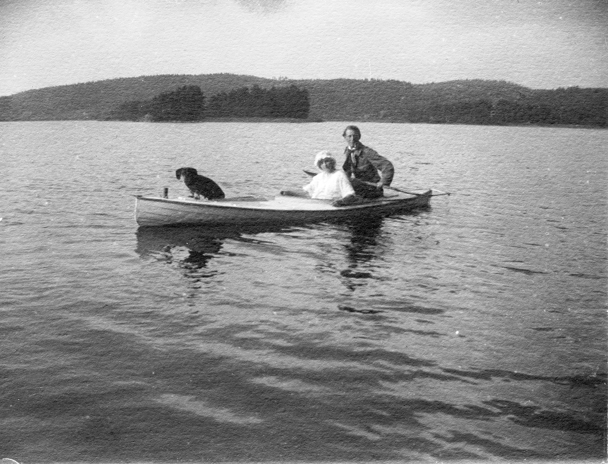 John och Ester Bauer i en kanot på sjön Bunn utanför Gränna. Deras tax "Pojken" sitter i fören.