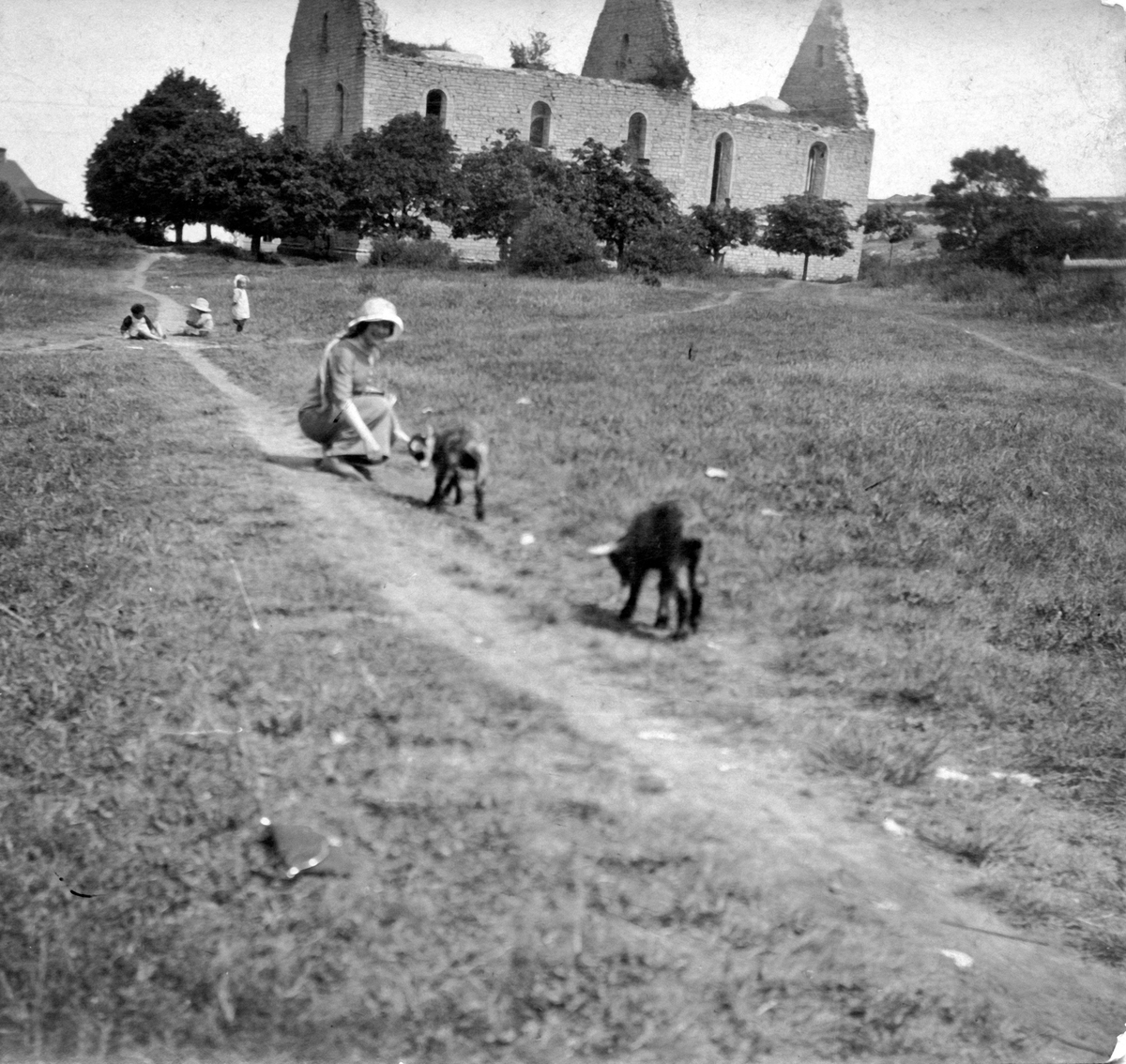 Framför ruinen efter S:t görans kyrka i Visby finns en gräsplan med gångstigar. Där sitter Ester Ellqvist-Bauer och lockar till sig två getter. Bakom henne leker några barn.