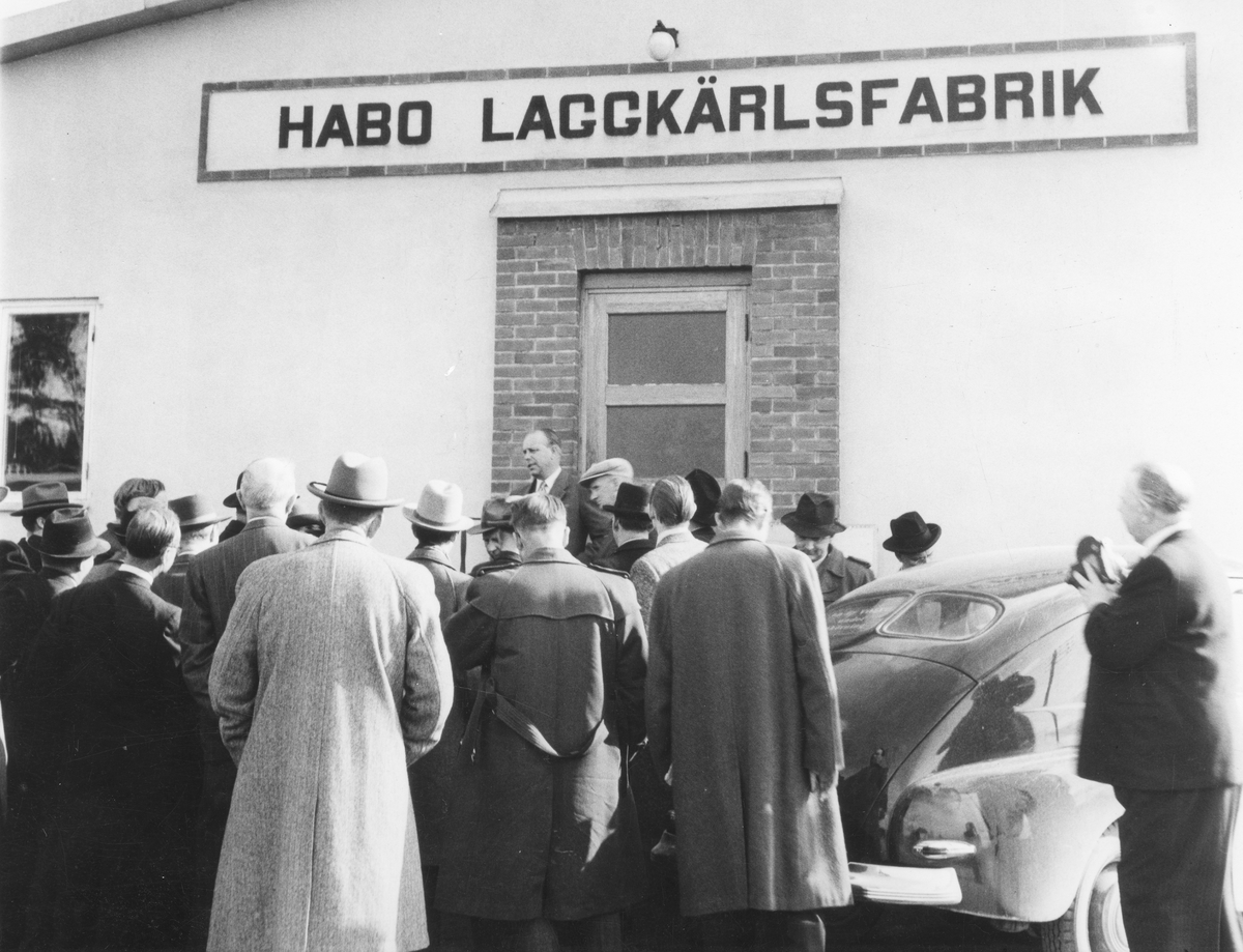 Pressinbjudan i samband med Riksutställningen år 1949. Journalister från hela landet besöker Habo Laggkärlsfabrik för att informeras om den "hopfällbara lådan" typ Hansson Faggesson.