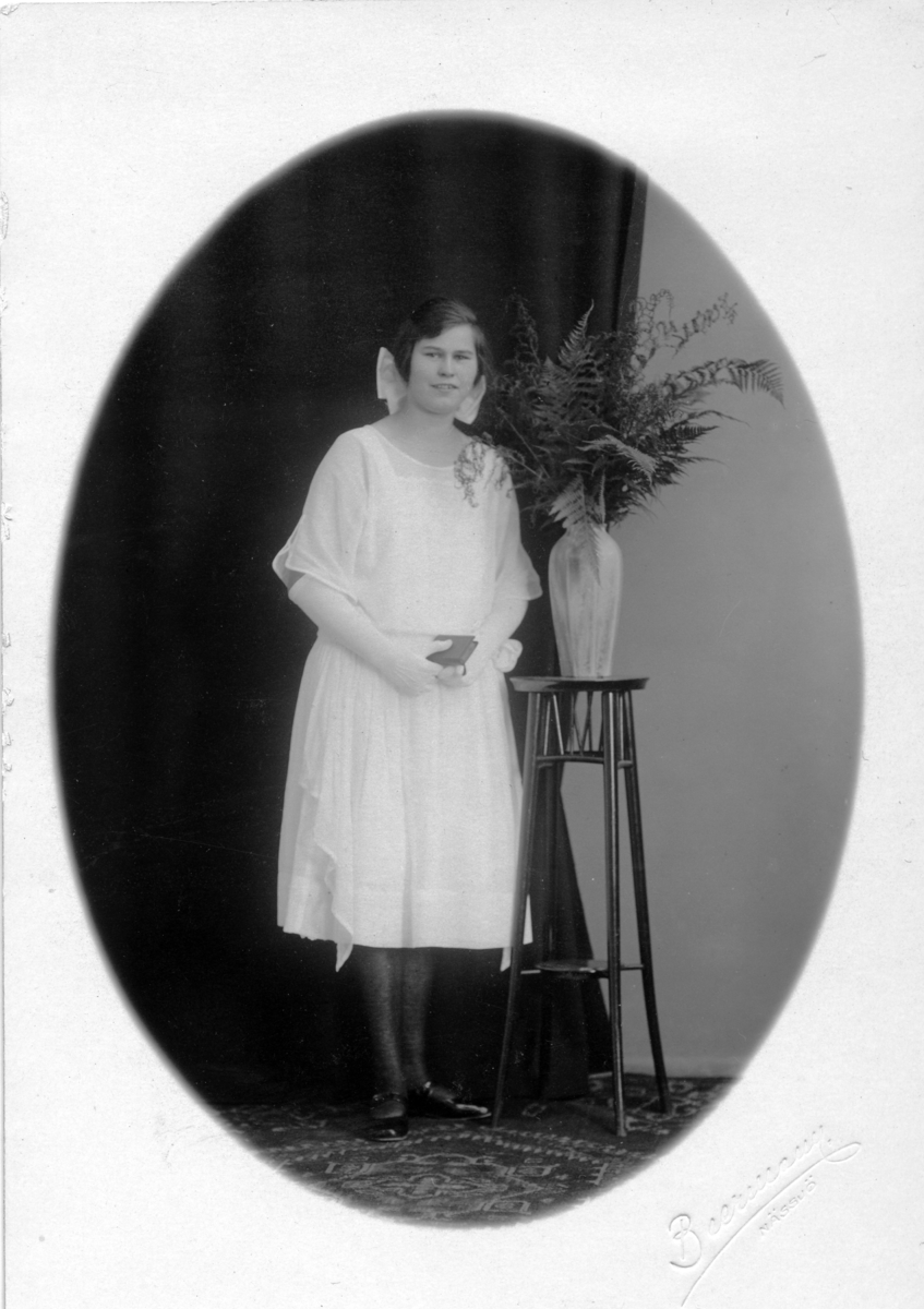 Porträtt av Ingrid Andersson som konfirmand. Hon utbildade sig till sjuksköterska inom psykiatrin och arbetade senare vid Ryhovs sjukhus i Jönköping.
