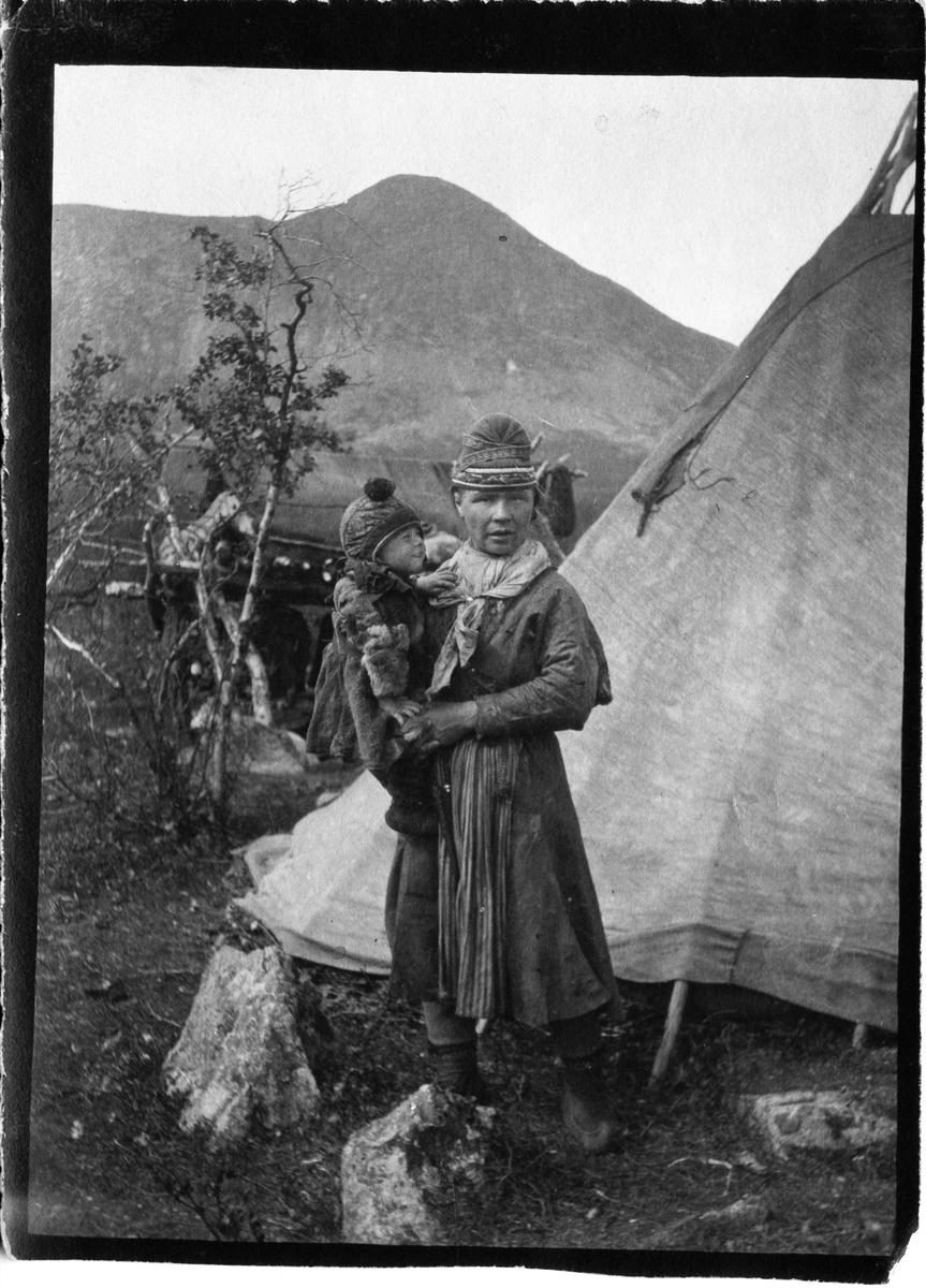 John Bauers Lapplandsresa sommaren 1904. Utanför en kåta i Ripanenjoki står en kvinna med ett barn i famnen.