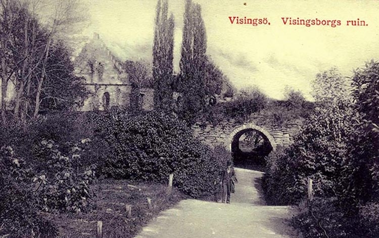 Ett vykort med motiv från Visingsborgs slottsruin på Visingsö. En gångväg genom porten i fästingsvallen leder till slottsruinen.