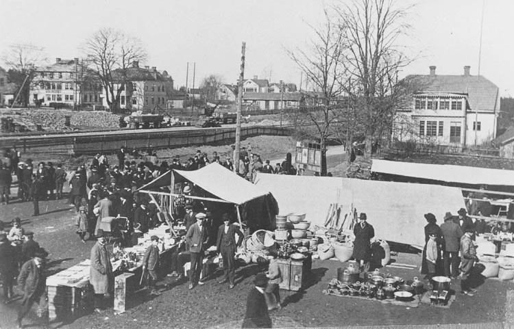 Marknad i Aneby. I bakgrunden till höger ligger mejeriet och till vänster vid järnvägen Målkvists café.