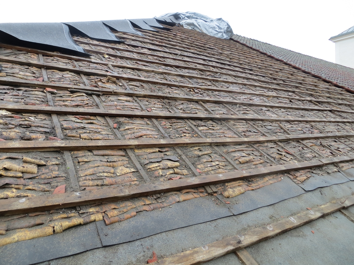 Malmbäcks kyrka, detaljbild på underliggande näverskikt, samt senare lagningar i papp som framkom vid takrenoveringar på kyrkan.