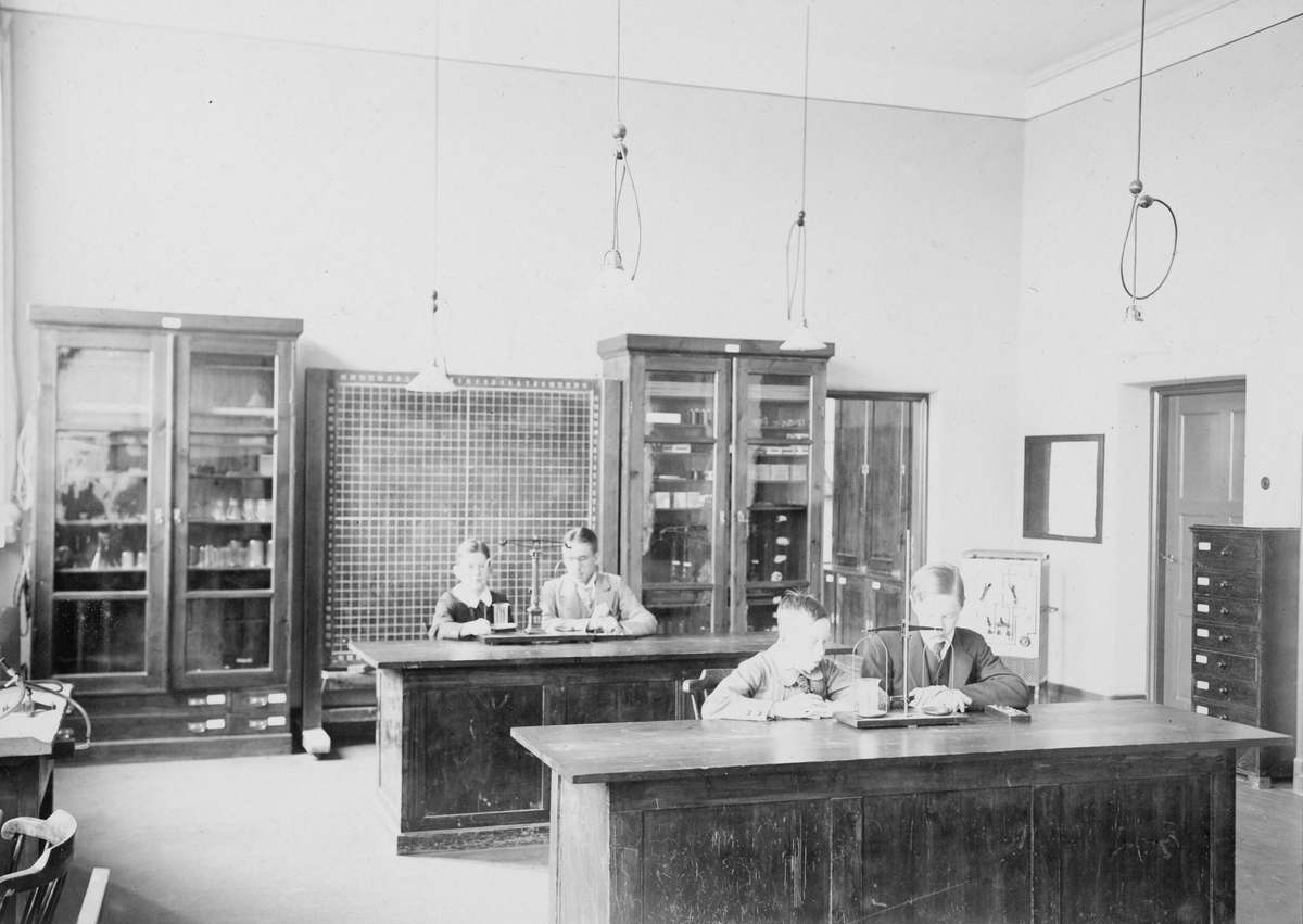 Jönköpings högre allmänna läroverk. I ett klassrum har några elever har en våg framför sig på bänken och gör en laboration.