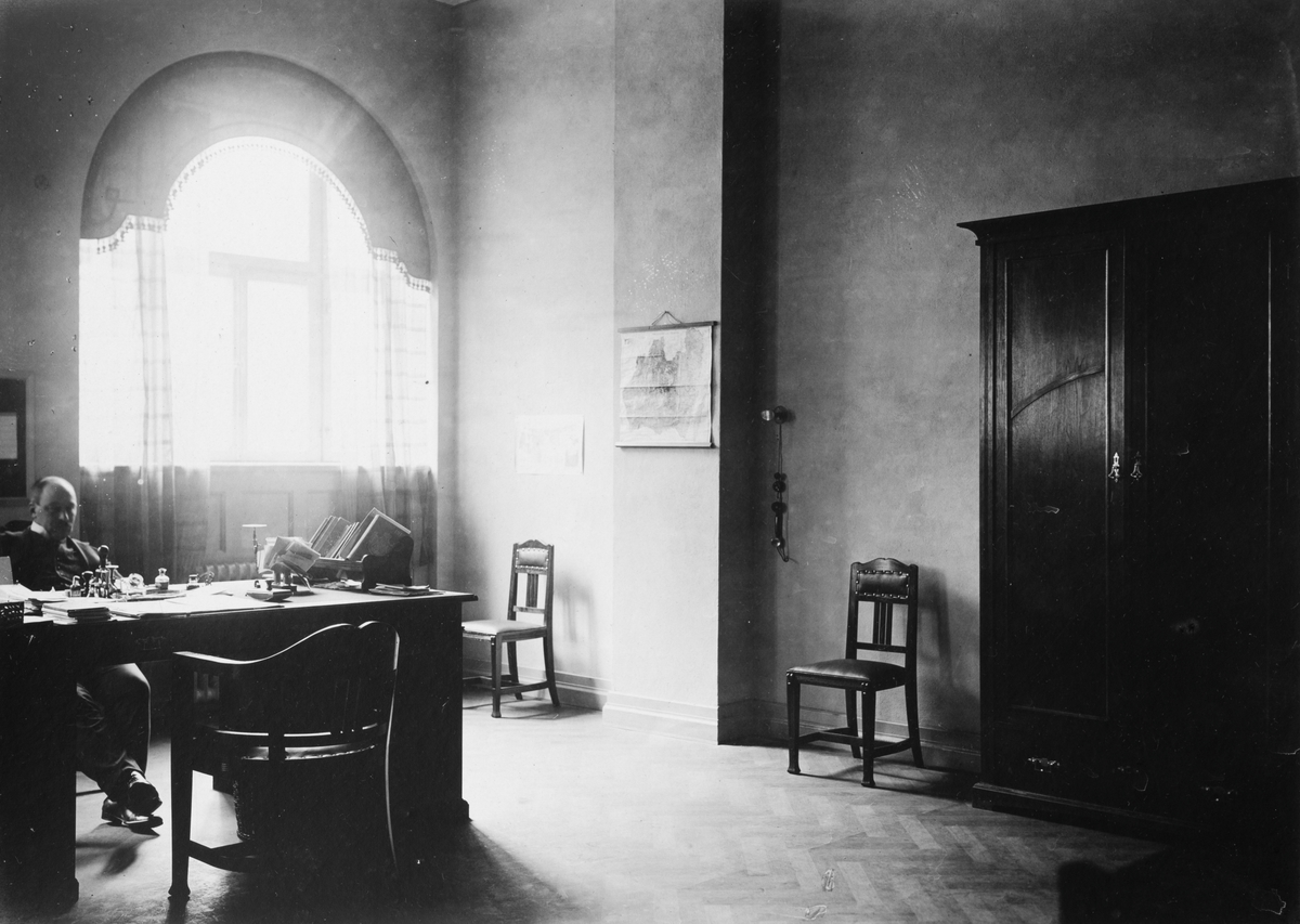 Jönköpings högre allmänna läroverk. En man sitter vid sitt skrivbord. Ett stort skåp står vid ena väggen och ljuset faller in över rummet från ett stort fönster.