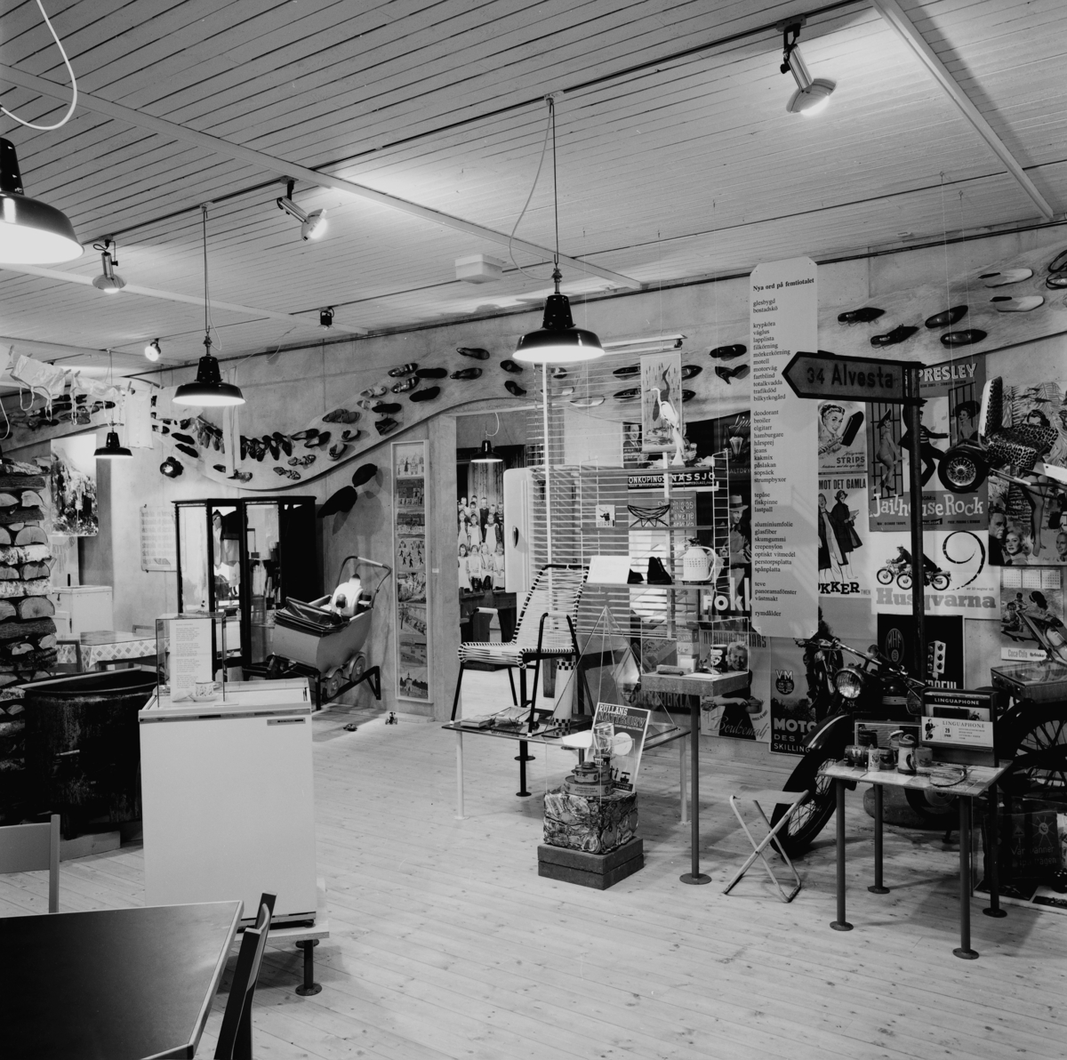 Utställning Tiotusen år. Utställningsdelen översikt över 50-tal, med trädgårdsstol och Stringhylla. På väggen bakom en parad av skor och skyltar ur Löfskosamling, från 1909 till 1970.
