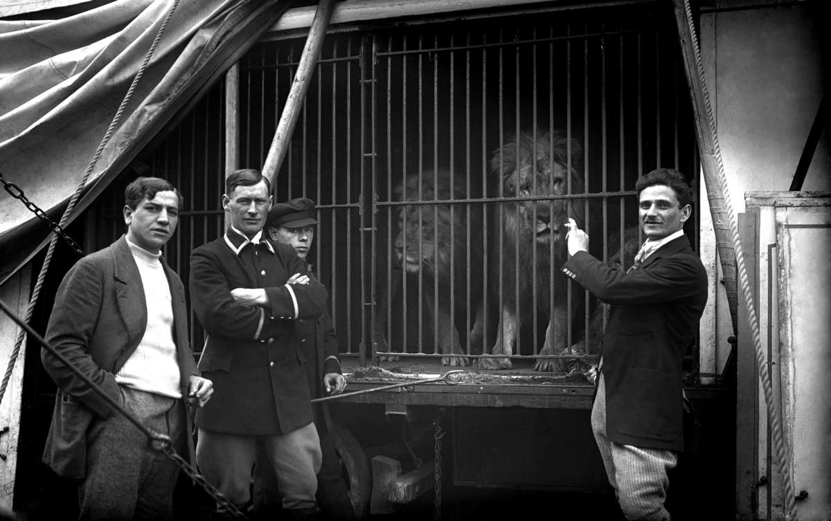 Sommaren år 1916 var den tyska cirkusen Carl Hagenbeck på besök i Jönköping. Den blev förlagd till området strax öster om Södra skolan på Torpa. Framför lejonburen står fyra män från cirkusen. Längst till höger står möjligen cirkusdirektören själv, Lorenz Hagenbeck (1882-1956).