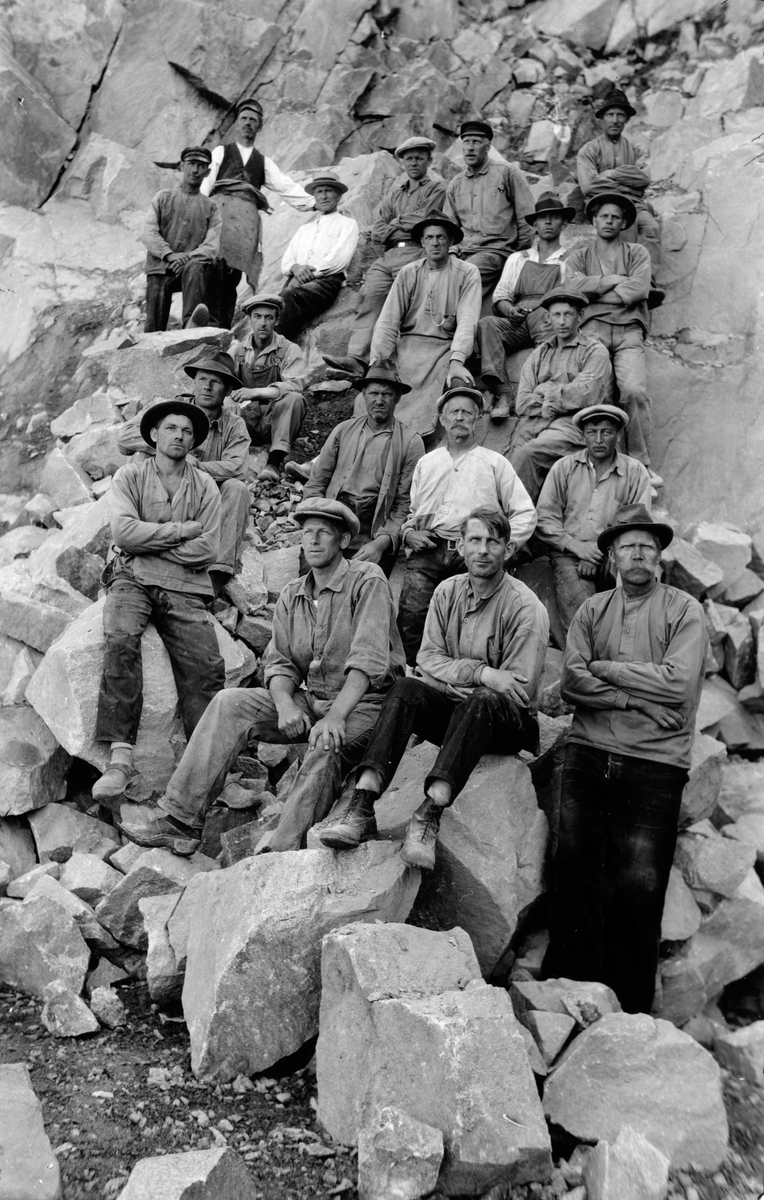 Arbetare vid "Nubbestensberget" i Mariebo i Jönköping omkring år 1930. Idag är stenbrottet igenfyllt med byggnadsavfall. 1:a raden: Stefanus Sandström (4), 2:a raden: Erik Sandström (1), Johansson (2), Hjalmar Oldenburg (3, i vita skjortan).