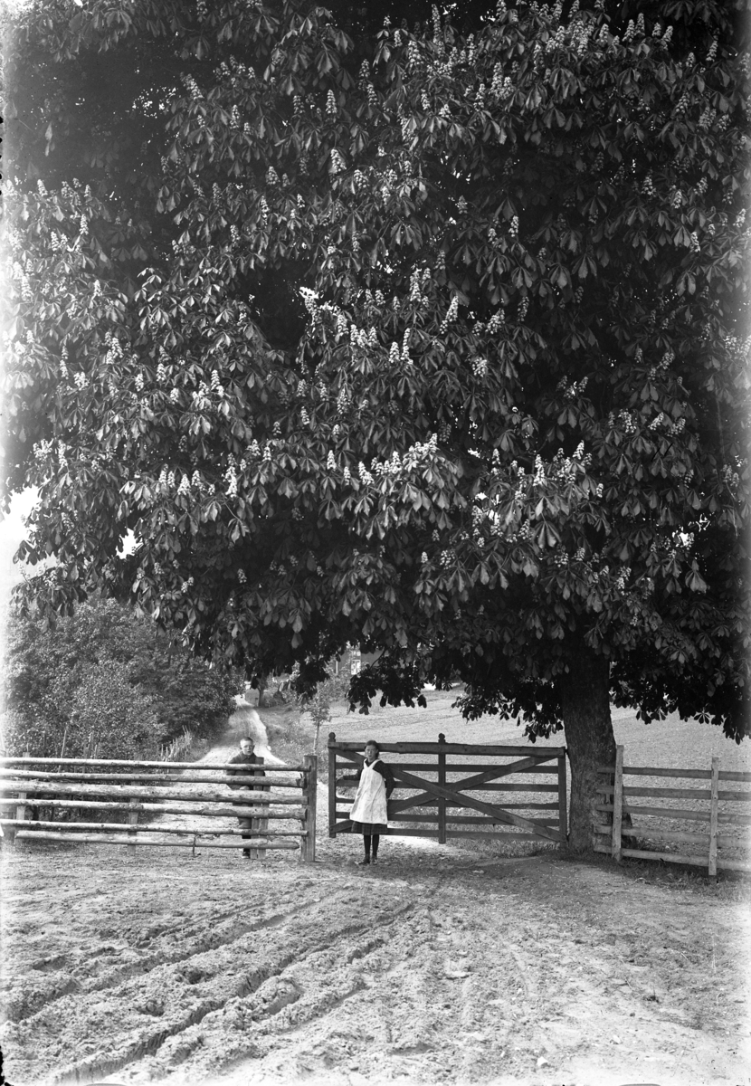 Britta Neij-Matsson 10 år och hennes bror Nils 11 år står vid grinden under det stora kastanjeträdet i närheten av Torpa Herrgård i Jönköping.