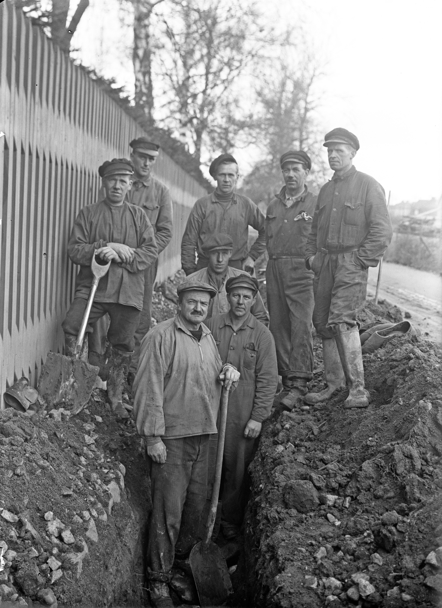 Gasverksarbetare i Jönköping: Vallberg (1), Erik Wetterbring (2), Sander (3), Axel Persson, i diket (4), Paul Dimberg (5), Gustav Johansson d.1982 (4 stående högre upp), Gottfrid Gustavsson (7).