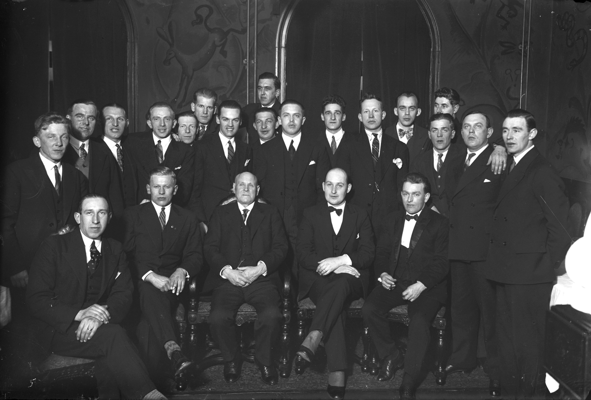 En gruppbild på män i sober omgivning.
