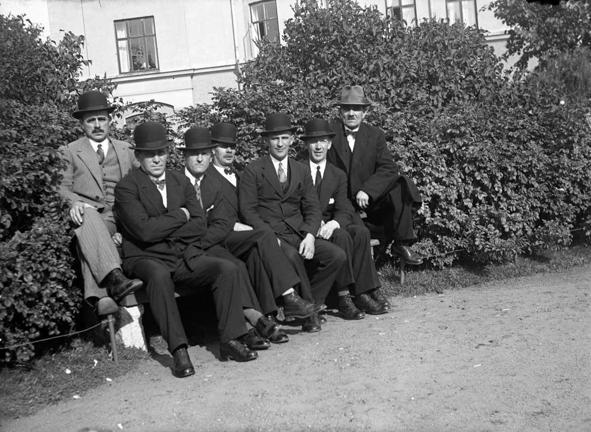 Sju män, alla klädda i kostym och hatt, sitter på en bänk framför en plantering vid ett bostadshus.